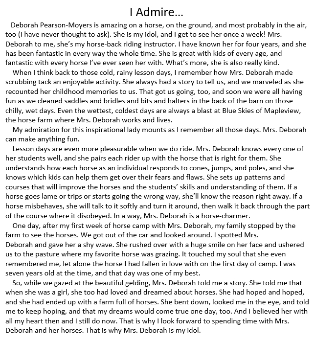 My daughters have been learning to care for and ride horses at Blue Skies of Mapleview for 8 years, and I really cannot rave about Deborah and Blue Skies enough. Many people associate riding with a heavy emphasis on showing and competing, and there are plenty of barns that cater to that. But if you're looking for a different, more holistic experience, you could not do better than Blue Skies. There, your kids will learn not just riding but also empathy (Deborah's always telling the students "Thank your horse"), responsibility (they tack up and groom the horses as well as ride, and if it rains, they clean tack), and attentiveness (paying attention to their horse's demeanor and mood). Deborah's fantastic with kids patient, gentle, and creative. And she's also super safety conscious, and makes sure her students have mastered and repeated basic skills until they're second nature. Plus, there are the physical benefits of riding it's athletic (anyone who thinks riding is not athletic has never ridden a horse!) and promotes good posture. And it's fun how many things can you say your kid enjoys immensely that also build character and muscles? - A